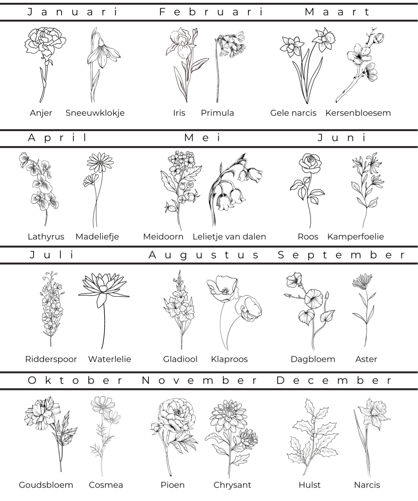Kijk in het overzicht hieronder welke geboortebloem bij jouw geboortemaand hoort. Elke maand heeft twee bloemen om uit te kiezen; of... kies voor een geboorteboeket. Ik 'pluk' de bloemen en maak er een mooi geheel van. Voor voorbeelden bekijk je de inspiratiepagina.